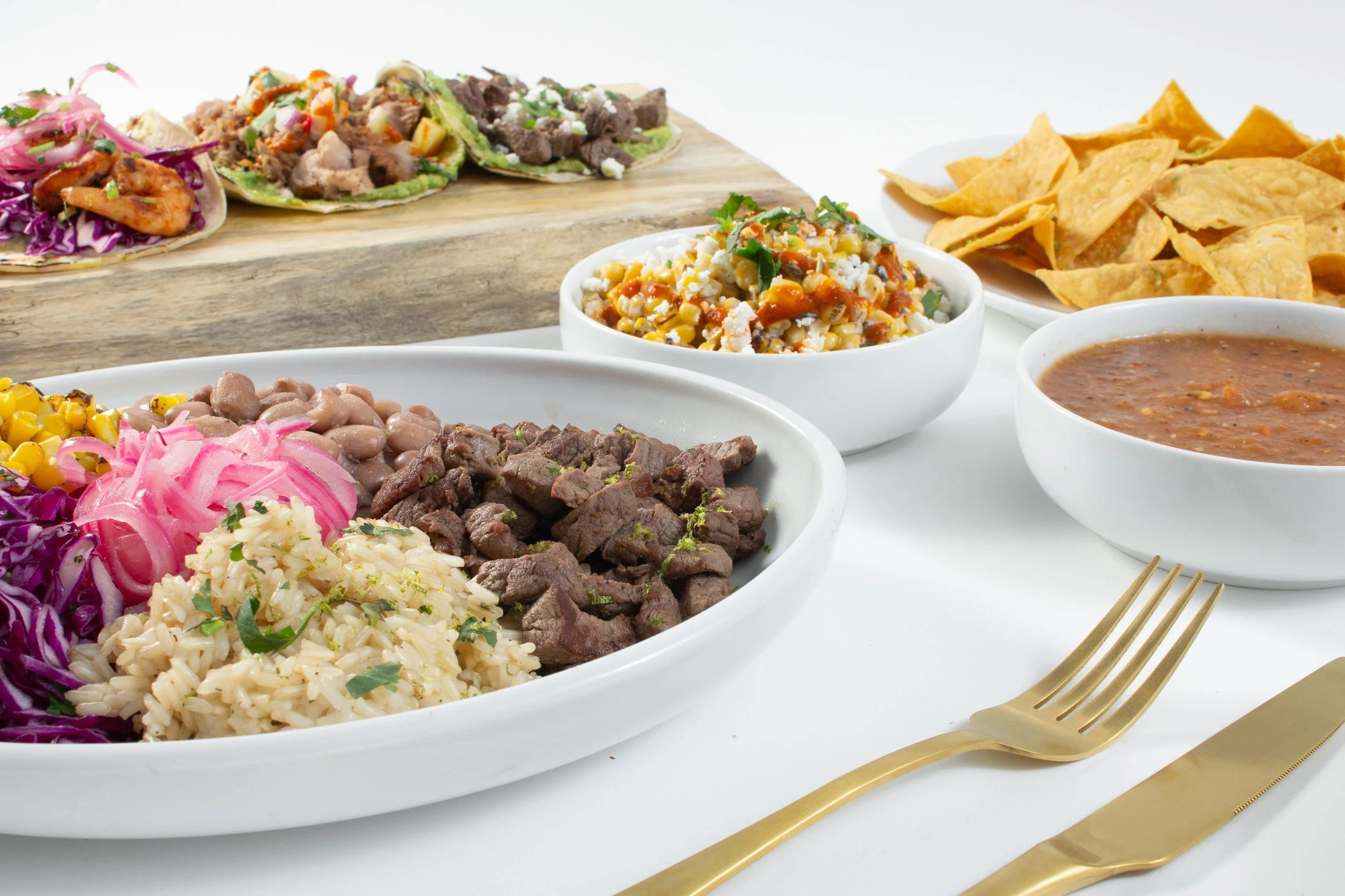 *All come with cilantro lime rice, pinto beans, grilled corn, citrus red cabbage slaw.